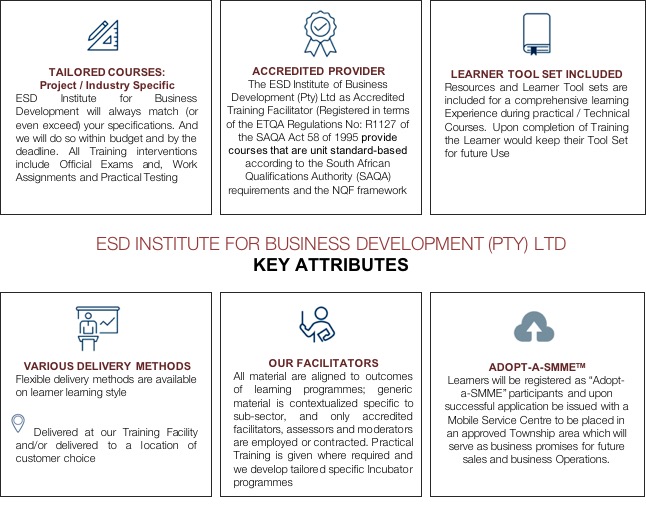 Founded in 2016, THE ESD INSTITUTE FOR BUSINESS DEVELOPMENT (PTY) LTD ’s mission is to radically transform, modernize and re-industrialize (TMR) economy in order to create jobs, eradicate poverty and significantly reduce inequality, by unlocking the potential of South African entrepreneurs through enterprise and supplier development, training, skills transfer and Incubation initiatives.